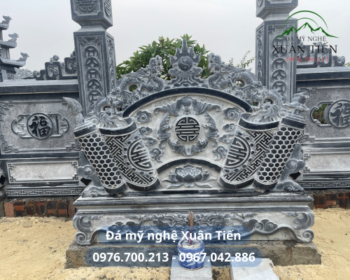 Đi vào phía trong cổng, ở đây mình có đặt 1 bức bình phong. Có chiều rộng là 1,57m, và chiều cao là 1,37m, ở phía mặt trước đây thì mình có đục hoa văn là ngũ phúc lâm môn, và các đường nét hoa văn rất là sắc nét. Xét về phong thuỷ thì bức bình phong này có tác dụng là chấn mọi tà khí xấu vào trong lăng mộ nhà mình.